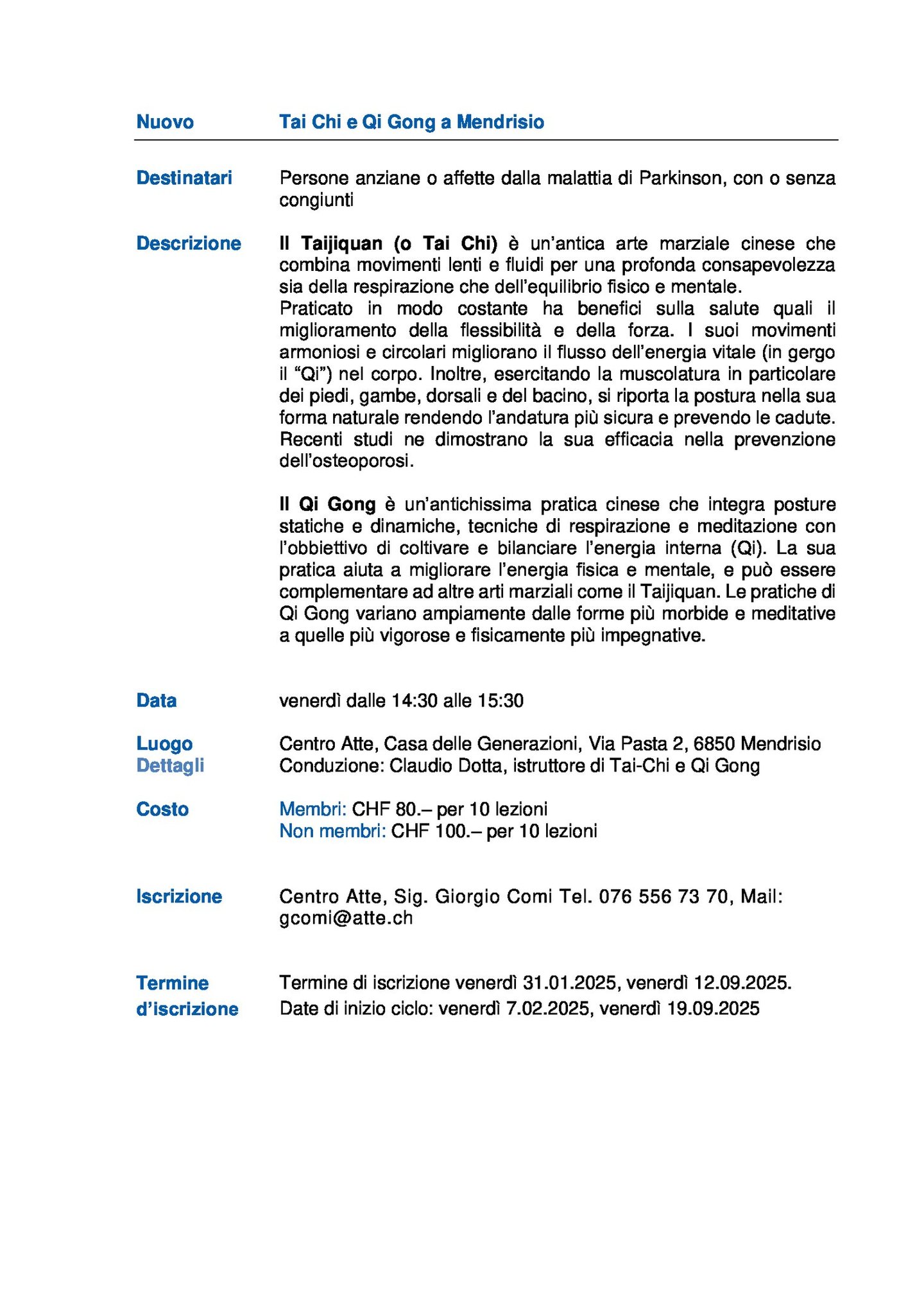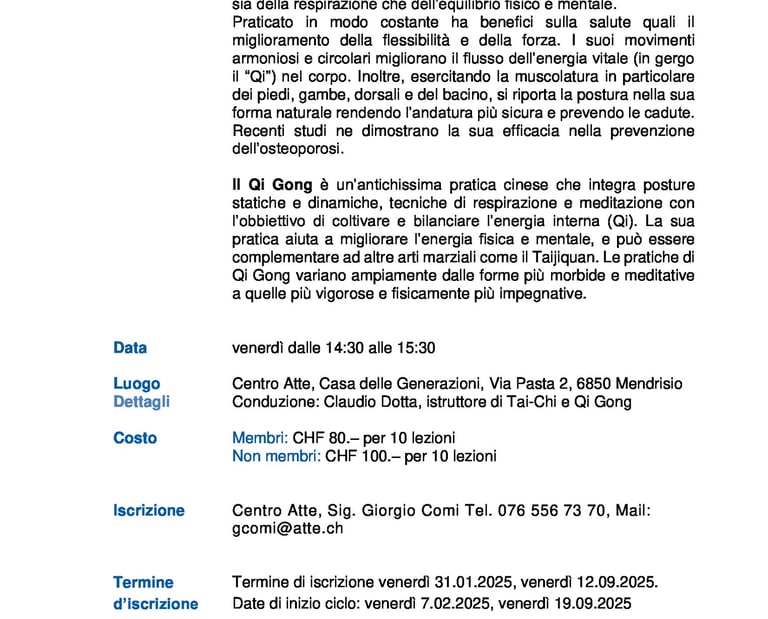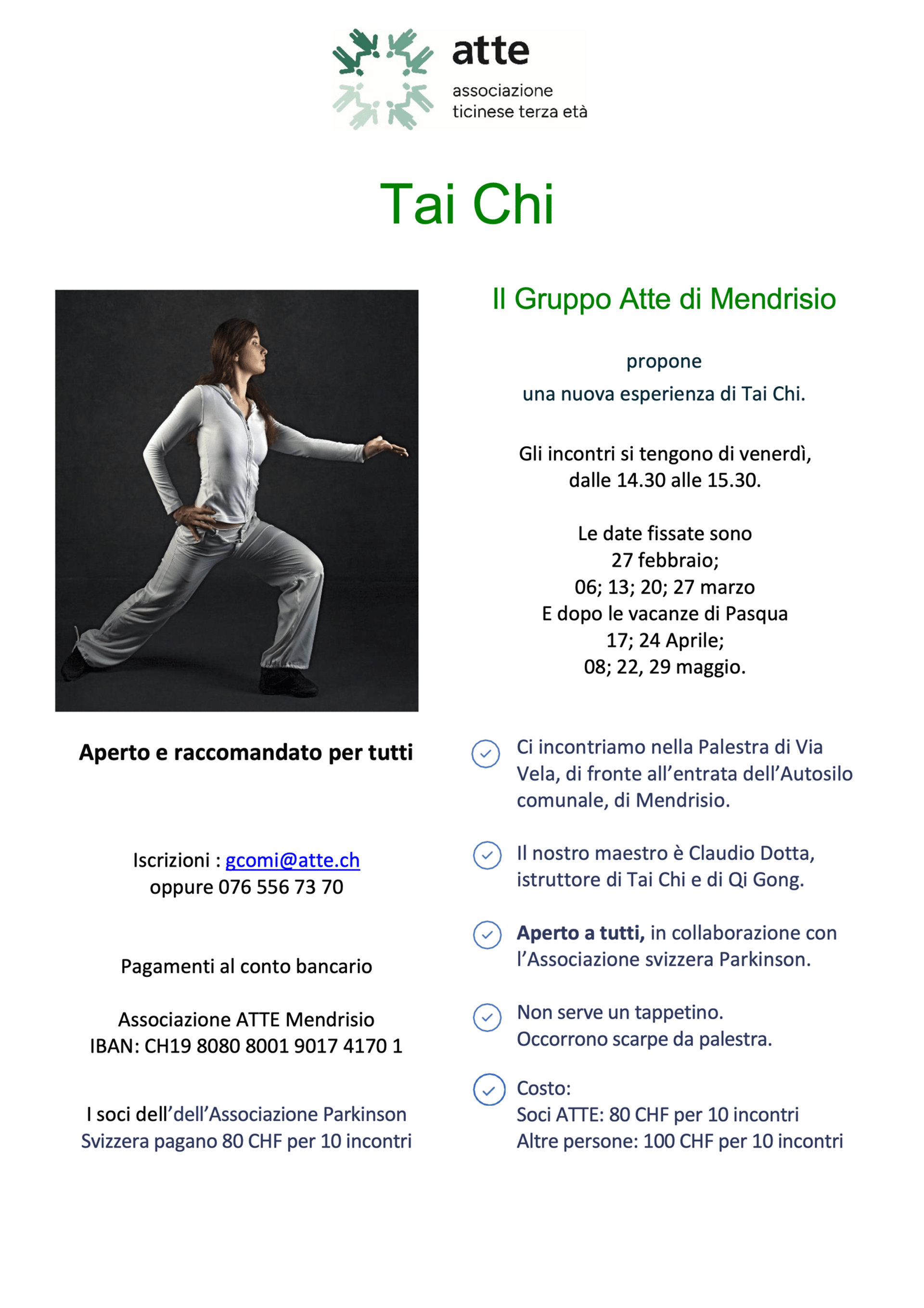 Lezione di prova, venerdì 15.11.2024 Casa delle generazioni e centro ATTE Mendrisio Si trova presso: parco San Giovanni Indirizzo: via Carlo Pasta 2
